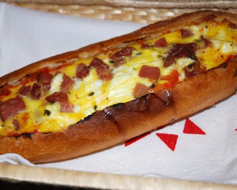 Tallar la part superior de l'entrepà deixant com una banyera dins perquè no surti l'ou batut. Untar tot l'interior amb el tomàquet
