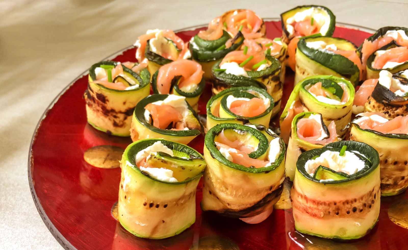 Després, feis les anelles. Esteneu una làmina de carabassó sobre la taula de treball. A continuació, untau-hi una capa fina de formatge, col·locau-hi una tireta de salmó al damunt i enrotllau-ho amb cura fins a formar una anella compacta.