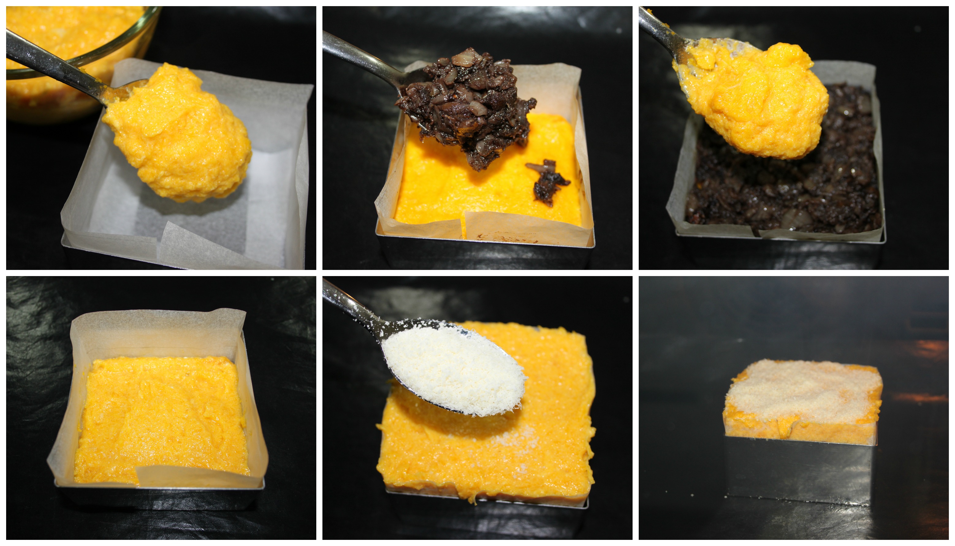 9.-Trau del forn i fica la capa de botifarra i una altra capa de carabassa. Fica una mica de parmesà per damunt.