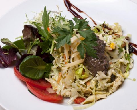 En un plat, hi posam les fulles d´espinacs, algunes tallades de pernil d´ànec i nous senceres.