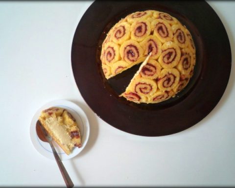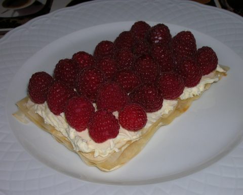 Sobre una fulla de masa filo plegada (amb mantega entre cada capa) i fornejada, posar mascarpone endolcit amb sucre llustre. Cobrir amb