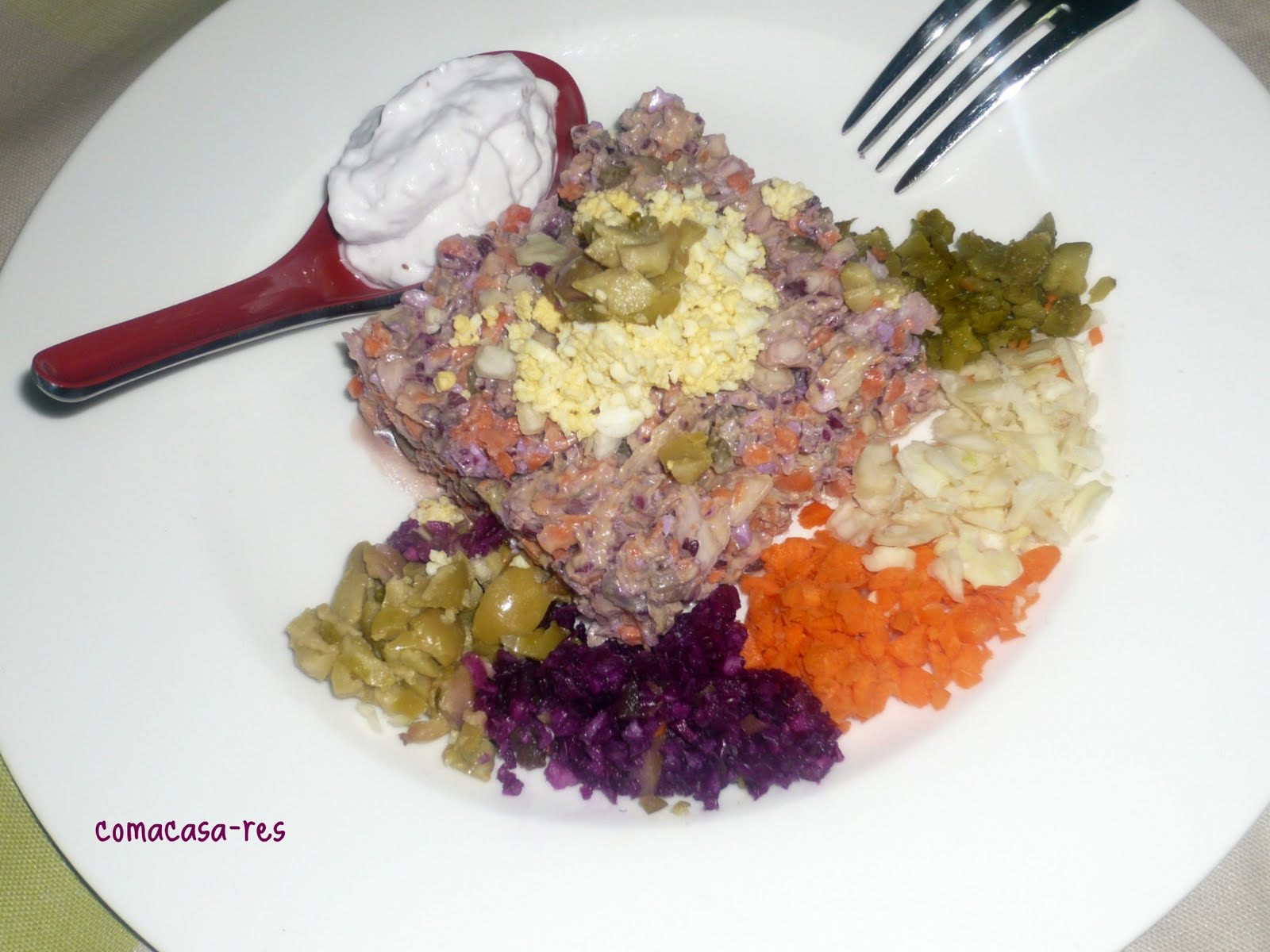 Reservem una mica de cada ingredient i el presentem en una safata amb més lactonesa en un bol, per si algú no ho vol barrejat o no li agrada algun ingredient.