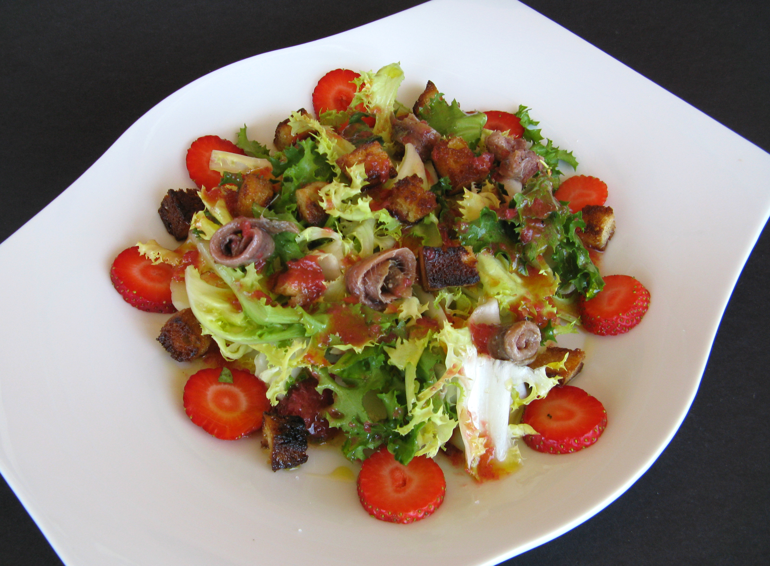 Posem al plat una base de patata bullida amb pell, pelada i tallada a làmines, que salarem i amanirem amb una mica d’oli; a sobre hi posarem escarola neta i tallada, uns daus de pa fregit i les anxoves enrotllades. Unes quantes rodanxes de maduixes al voltant del plat augmentaran el color i el contrast salat-dolç i cruixent-tou, i finalment ho amanirem tot amb la vinagreta de cireres.
