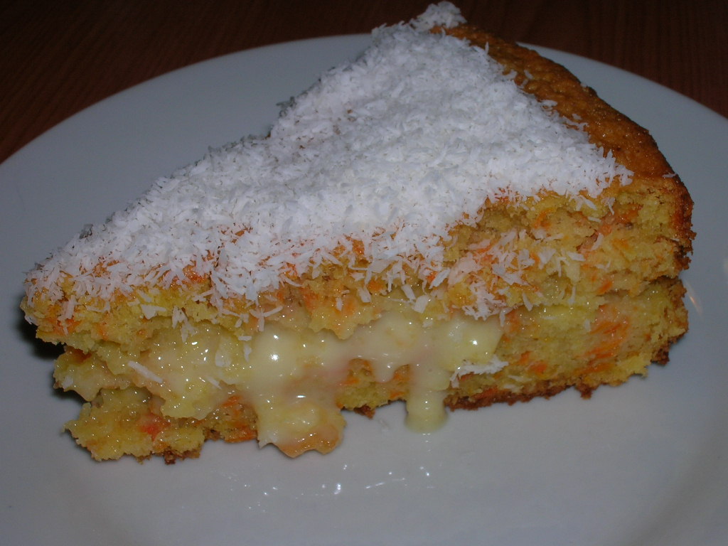 Bateu 4 ous amb 200 g de sucre. Després, hi afegiu 250 g d’ametlla molta, 30 g de coco ratllat, la ratlladura de mitja llimona i mitja culleradeta de sal. Després, afegiu-hi 300 g de pastanaga ratllada, 16 g de llevat químic i 80 g de farina. A continuació poseu-ho en un motlle i al forn suau (18o º) fins que estigui cuit. Farciu amb una ganache líquida de xocolata blanca feta i desfeu 250 g de xocolata blanca amb 125 g de nata líquida i 125 g de mantega. Després, afegiu-hi 50 ml de licor de coco. Quan estigui barrejat, deixeu-ho refredar.