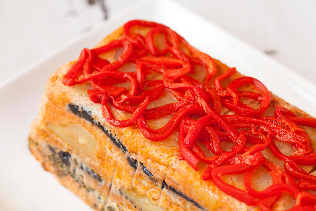 Folrau el fons i les parets d’un motlle de plum cake amb paper sulfuritzat. Col·locau-hi capes de patata, albergínia i carabassó, alternades al vostre gust, però de manera que no quedin espais buits. Premeu-ho amb els dits i abocau la mescla d’ous, nata i salsa de tomàtiga per damunt. Sacsau el motlle perquè es distribueixi uniformement.