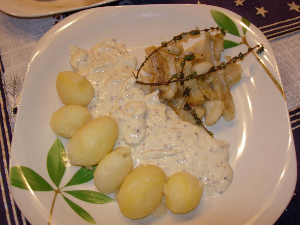 Posau el bacallà cuit en un plat, afegiu-hi la salsa i acompanyau-lo de les patates.