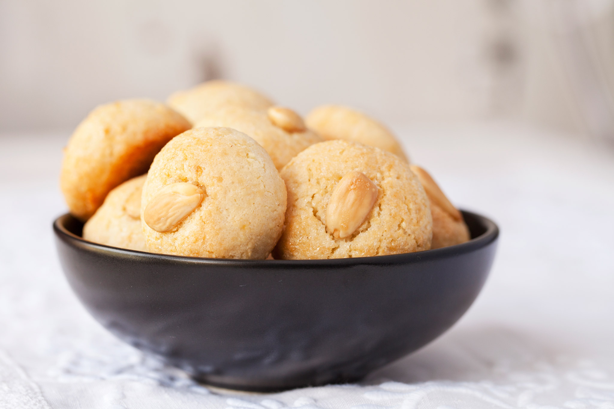 Formau bolletes amb la pasta d’ametla. Untau-les amb el blanc d’ou remenat i col·locau damunt cada bolla una ametla crua, pressionant només una mica.
