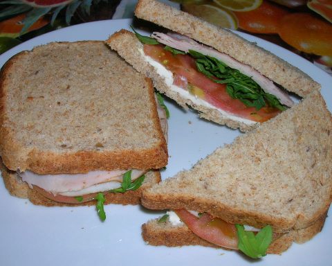 Sobre una llesca de pa integral, posar una mica de formatge Emmental, tomàquet a llesques fines i fulles de rúcula. Cobrir amb