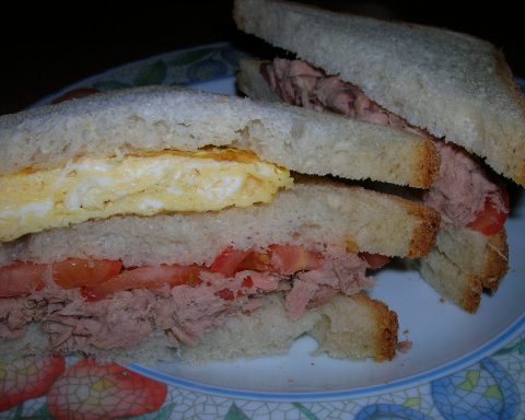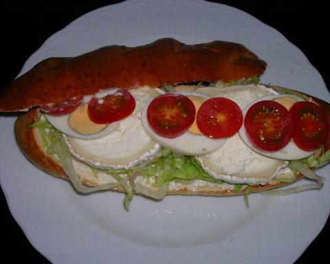 Sobre una llesca de pa, posar un tros de truita a la francesa; a sobre, una altra llesca de pa; a sobre,