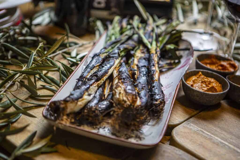 - Entrant: Calçots torrats amb sarment de celler Mortitx (oen tempura).