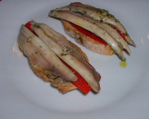 Sobre una llesca de pa torrat, posau-hi unes tires de pebrot escalivat i un seitó en vinagre.