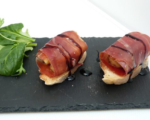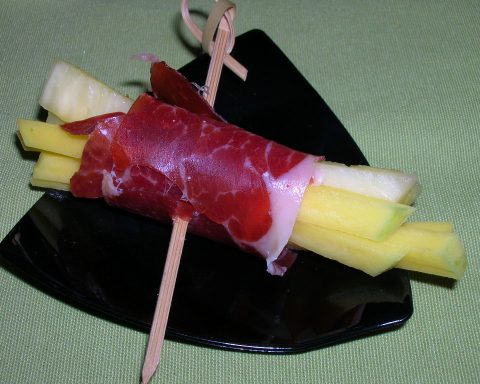 En mitja llesca de pernil, enrotllat pinya i mango tallats a bastons fins. Punxar amb un escuradents