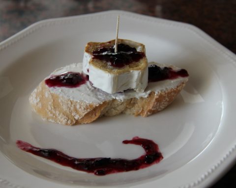 Untam de formatge crema la llesca de pa xapata. Després posam el formatge de cabra a la planxa, el dauram lleugeramanet i