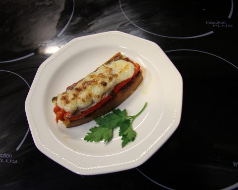 Damunt una llesca de pa torrat, hi col·locam tires de pebres vermells torrats, amanits amb sa,l all i oli. Hi posam damunt