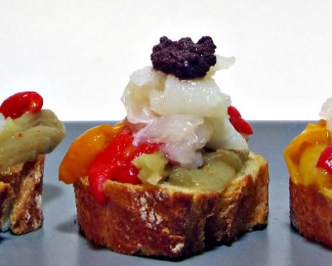 Barquetes d’escalivada amb bacallà esqueixat i olivada