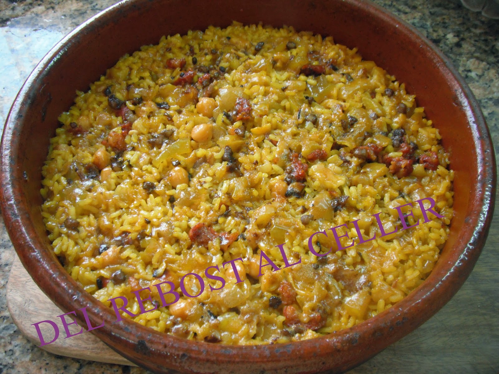 La primera cosa que hem de fer és posar a bullir la pota de vedella junt amb un pessic de pebre i unes fulles de llorer. Com requerix d’una cocció de dos o tres hores com a mínim, podeu accelerar el procés, fent-ho amb l’olla exprés. Una vegada ben bullida, coleu i reserveu el caldo. El treball més laboriós ve ara ja que, abans que es refrede del tot, hem de desossar la carn i tallar-la en trossos xicotets. Després, peleu i picau els alls, peleu i talleu la ceba en trossos xicotets. Lleveu la pell de la botifarra i el xoriço i esmicoleu tot l’embotit. A continuació, escalfeu l’oli en una cassola de fang i sofregiu la ceba i els alls. Quan comence a agafar color, afegiu-hi l’embotit. Sofregiu-lo. També, afegiu-hi la tomaca fregid i mescleu-ho bé. És el moment d’afegir la carn, els cigrons olles i l’arròs. Li donem un parell de voltes a tot i reguem amb el caldo bullint. Quan comence a bullir altra vegada, tireu colorant i sal i deixeu-ho coure a foc mitjà uns 20 minuts fins que es consumisca el caldo. Mentre hi haja caldo caldrà remenar de tant en tant ja que al ser gelatinosa la carn se’ns pot aferrar l’arròs al fons de la cassola
