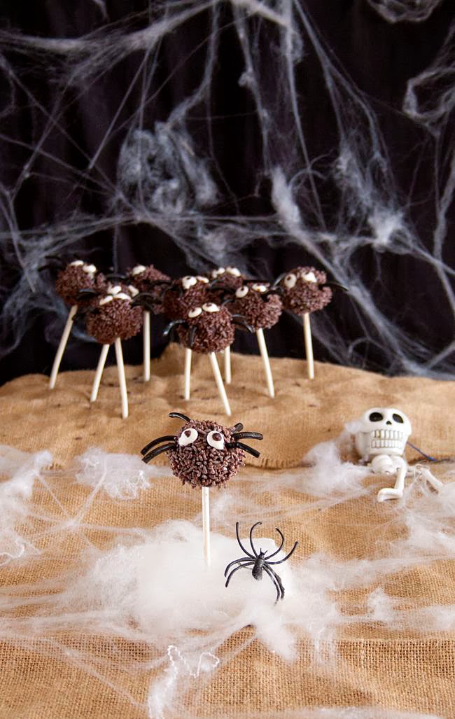 Va ser idea del meu fill preparar aranyetes de Halloween, i em va ajudar a banyar els cake-pops en els encenalls de xocolata. Les potes les vam fer amb regalèssia i els ulls amb caramels. El pitjor va ser trobar una base on poder punxar els palets, teníem unes planxes de suro que semblaven ideals però al final van ser un desastre i no hi havia forma de redreçar les aranyes….encara que com va dir el meu fill, són per fer por i així queden més autèntiques…bé…intenteu mirar-les des d’aquesta perspectiva 😉