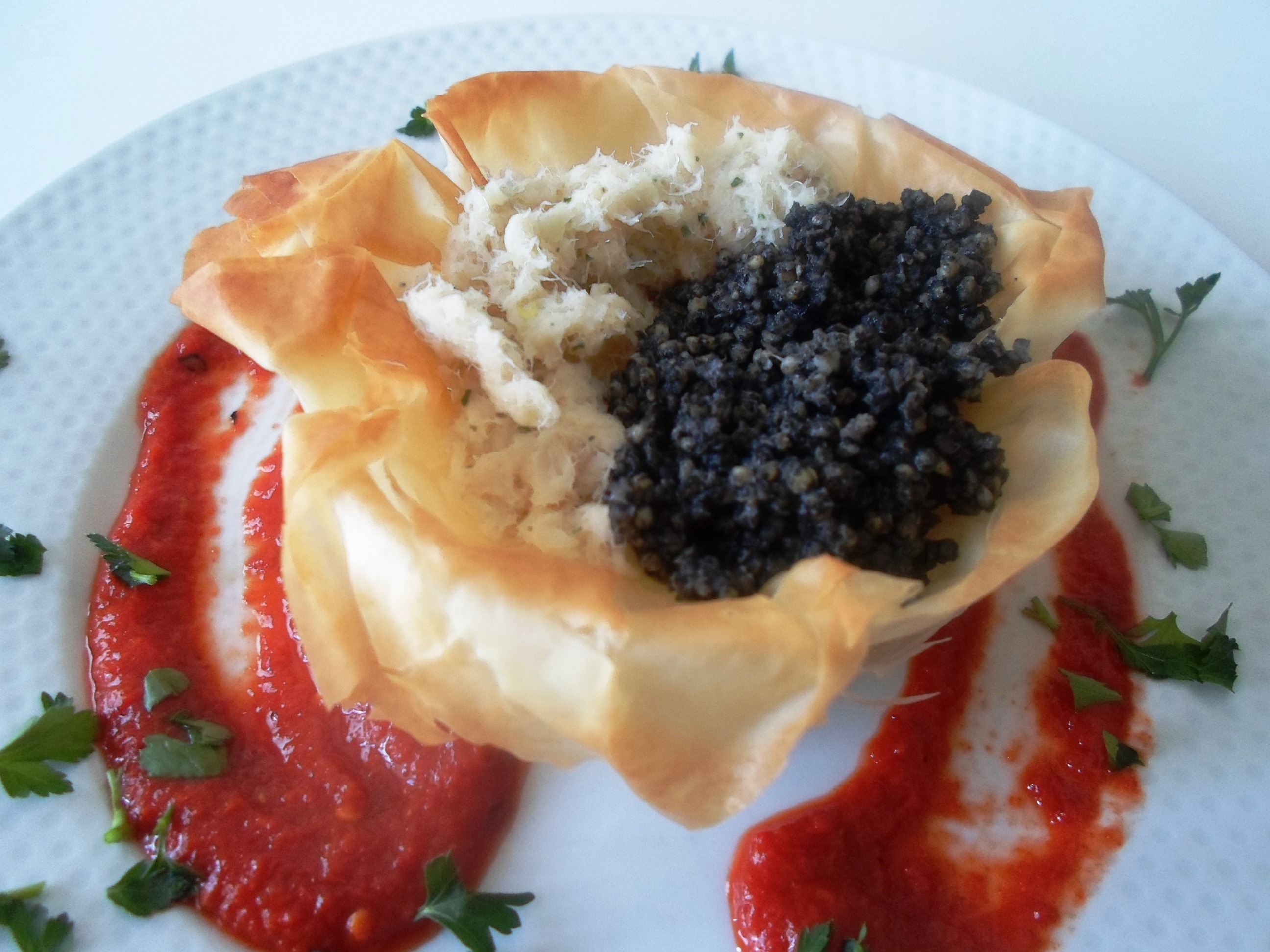5. Per emplatar, traiem amb molt de compte la cassoleta del motlle on l’hem cuit (pot ser una tassa, un motlle d’alumini…) i hi afegirem, en un cantó, el puré de bacallà, i en l’altre el fals caviar de mill. Finalment, decorem amb la salsa de pebrots i tomàquet i espolsem julivert picat.