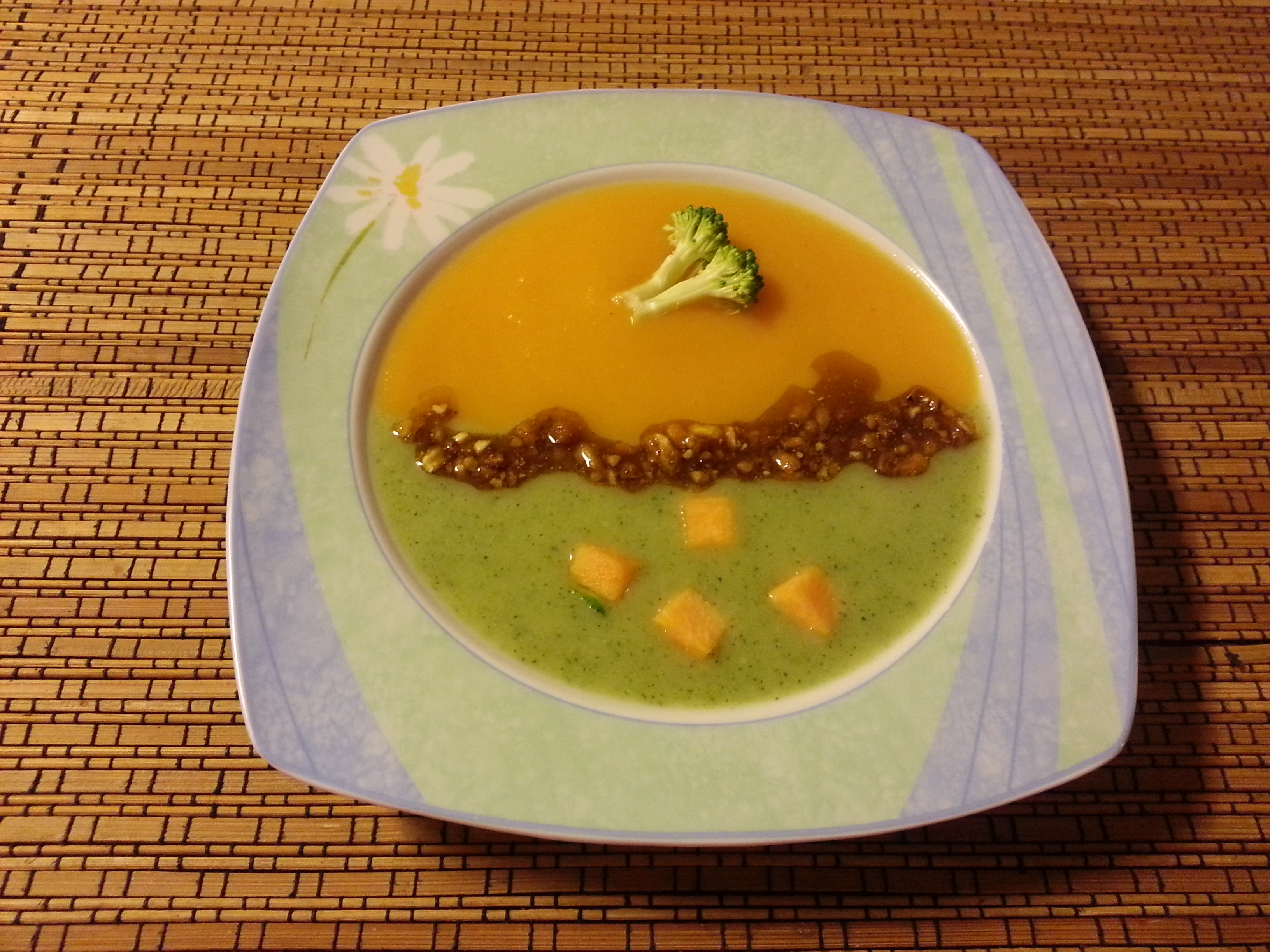 A l’hora de servir , aboquem en un plat fons les dues cremes al mateix temps , una per cada costat del plat , fins que s’ajuntin al centre. Acompanya amb uns dauets de carbassa sobre la crema de bròquil i uns ramells de bròquil sobre la crema de carbassa . Pinta una línia central entre crema i crema amb l’amaniment de blat de moro .