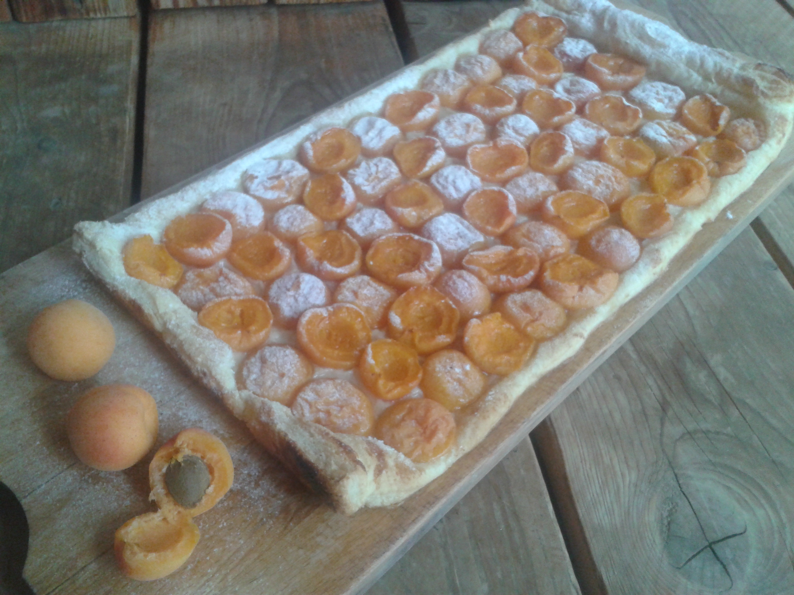 4.Col·locarem els albercocs damunt la pasta de fulls i escamparem sucre per damunt, intentant que en quedi per les voreres (damunt la pasta de fulls).