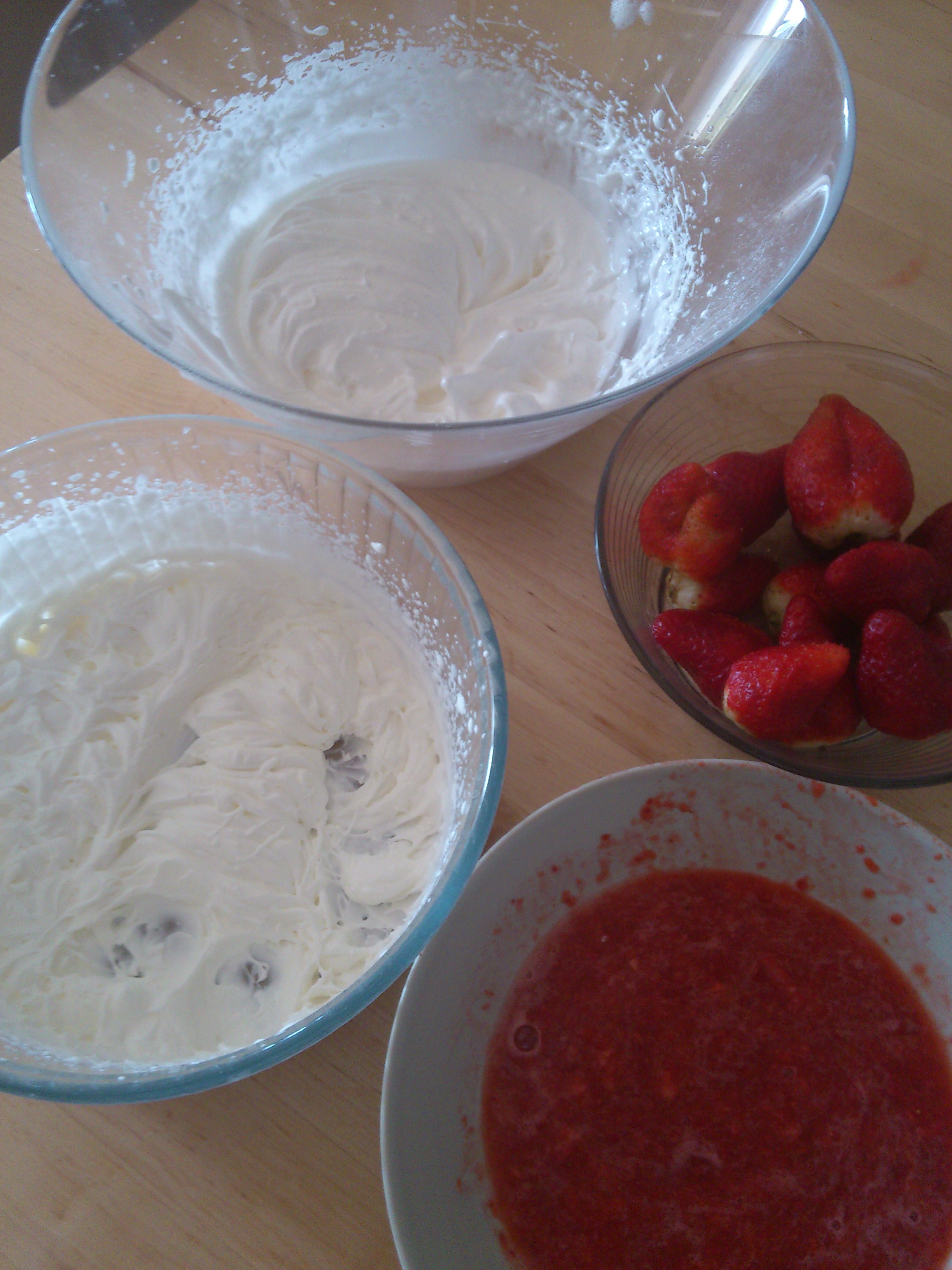 El tercer, mesclar els fulls de gelatina que estaven en remull amb una mica de polpa de maduixa i el suc de una llimona, ho encalentim fins que s¡hagi dissolt la gelatina. Ho mesclam amb la resta de la polpa i li ofegim a poc a poc la merenga, i en darrer lloc hi afegim la nata amb moviments envolvents.