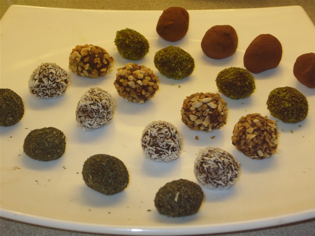 Foneu la mantega amb la xocolata al bany maria fins que es fongui i s’emulsioni amb la mantequilla. Quan ja s’hagi refredat afegiu-hi la llet condensada i mesclau-ho tot. Després, deixau-ho a la gelera almenys 12 hores. Per acabar, feis-ne bolletes i arrebossau-ho amb el cacau, els pistatxos, el crocant, el coco i la menta.