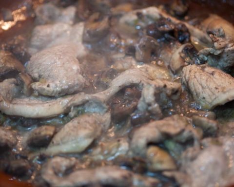 Dins una greixonera, encalentim l'oli, i hi posam la carn trossejada. La dauram i la remenam de tant en tant.