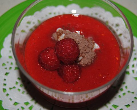 Triturem les maduixes, prèviament tallades a trossos, i els gerds, juntament amb el sucre llustre, el marc de cava i les gotes