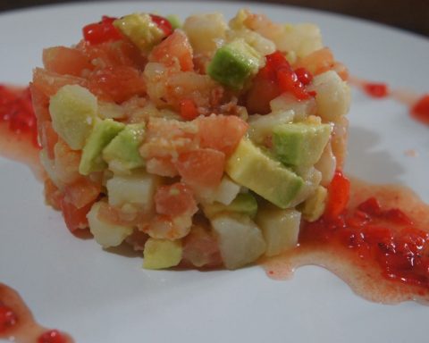 Tallau en petit les maduixes, afegiu-hi sal, pebre bo, la meitat del suc de llimona, i l'oli.