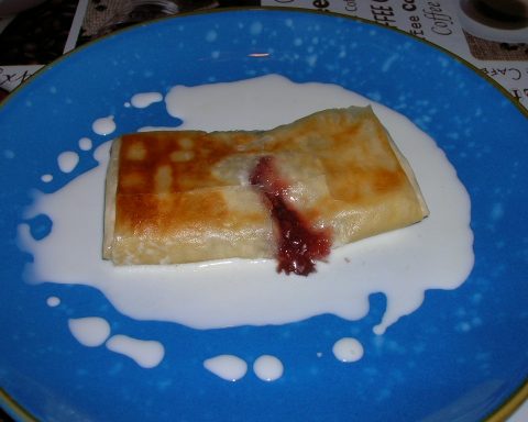 Tallar una fulla de massa filo en 2 tires. En una tira de massa filo pintada amb mantega, posar melmelada de maduixa