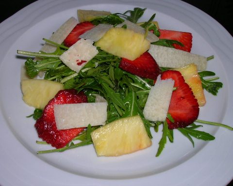 Amanir la rúcula amb una mica d'oli, vinagre, sal i pebre negre. Posar al plat amb unes làmines de pinya i maduixa