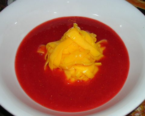 Talleu un mango en llàmines fines i cada làmina en tires. Poseu un grapat d'aquestes tallarines en un plat de manera que