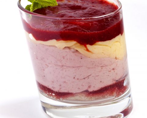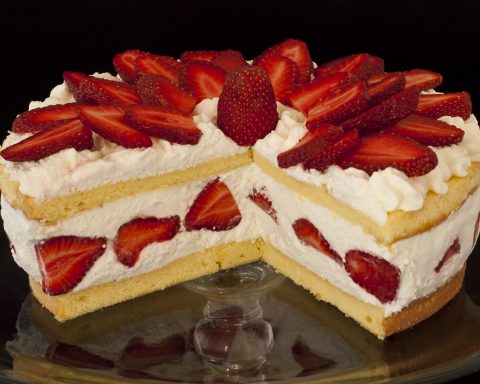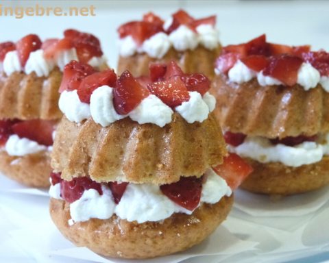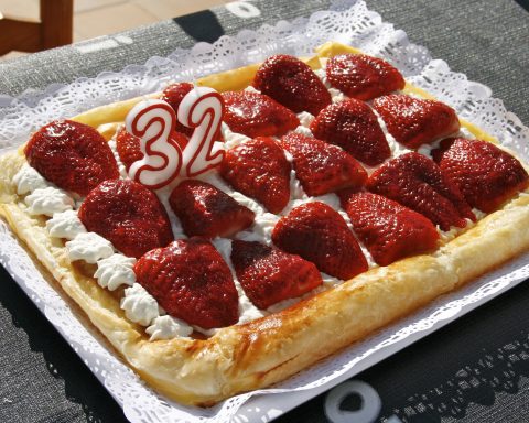 És un pastís en quatre passs: pasta de full, flam, nata i maduixes.