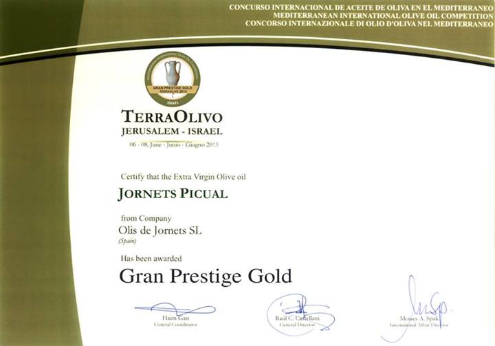 Oli de Jornets ha estat premiat amb la màxima distinció atorgada a Jerusalem (Israel) en el concurs internacional d’olis TerraOlivo, amb la medalla Gran Prestigi Or 2013.