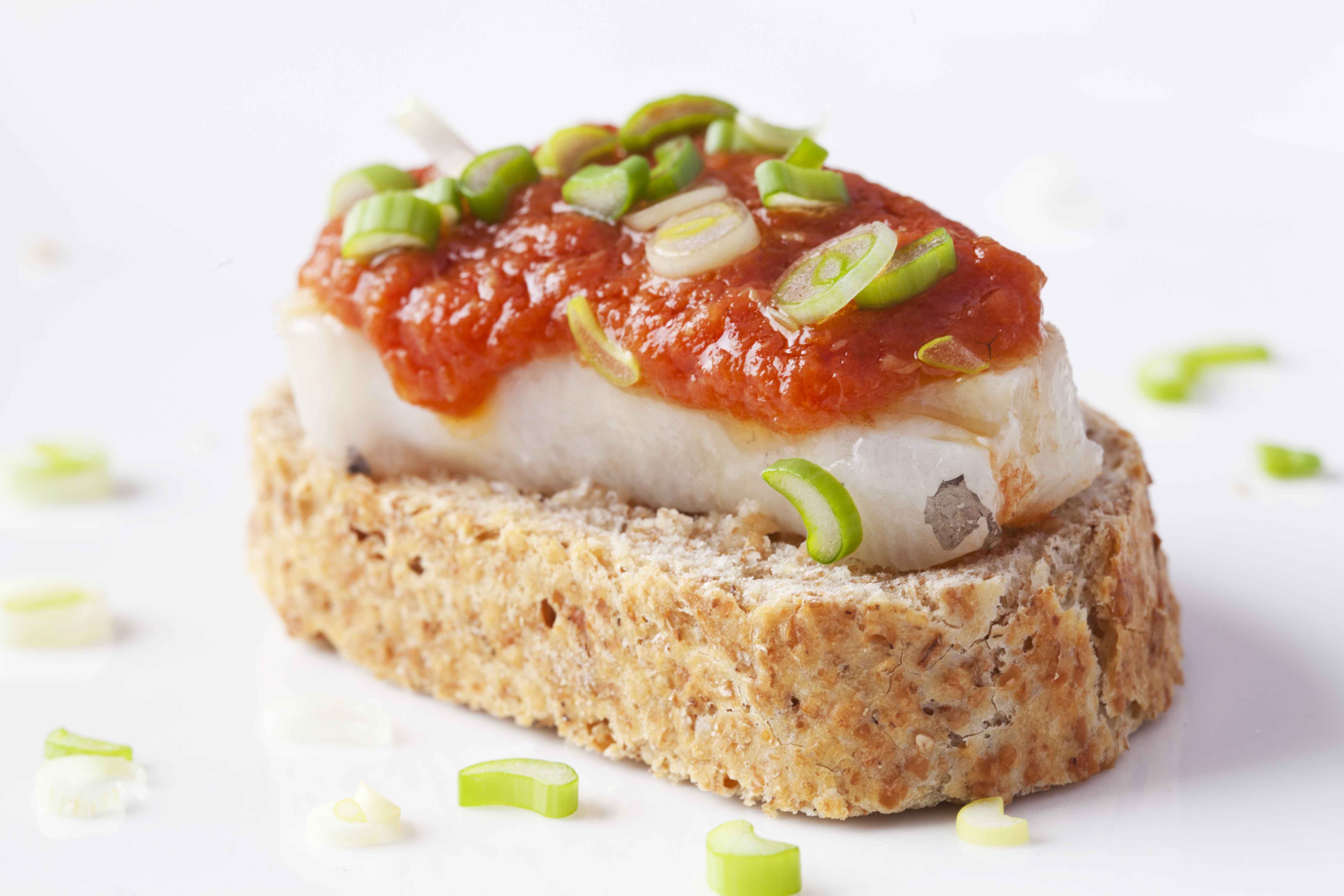 Per muntar el plat (feis-ho just abans de servir-lo perquè el pa no es reblaneixi), torrau les llesquetes de pa; rentau els grells i tallau-los a rodanxes molt primetes. Posau damunt cada llesca un un tros de bacallà marinat, una cullerada de salsa i un poc de grell a la superfície.