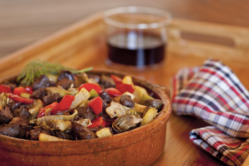 Netejau els pebres. Tallau-los per la meitat i tirau les llavors. Tallau-los en daus petits. Treis les fulles més exteriors de les carxofes, eliminau-ne les puntes i tallau els cors en làmines. Posau-les dins un plat amb aigua i suc de llimona perquè no s’ennegreixin.
