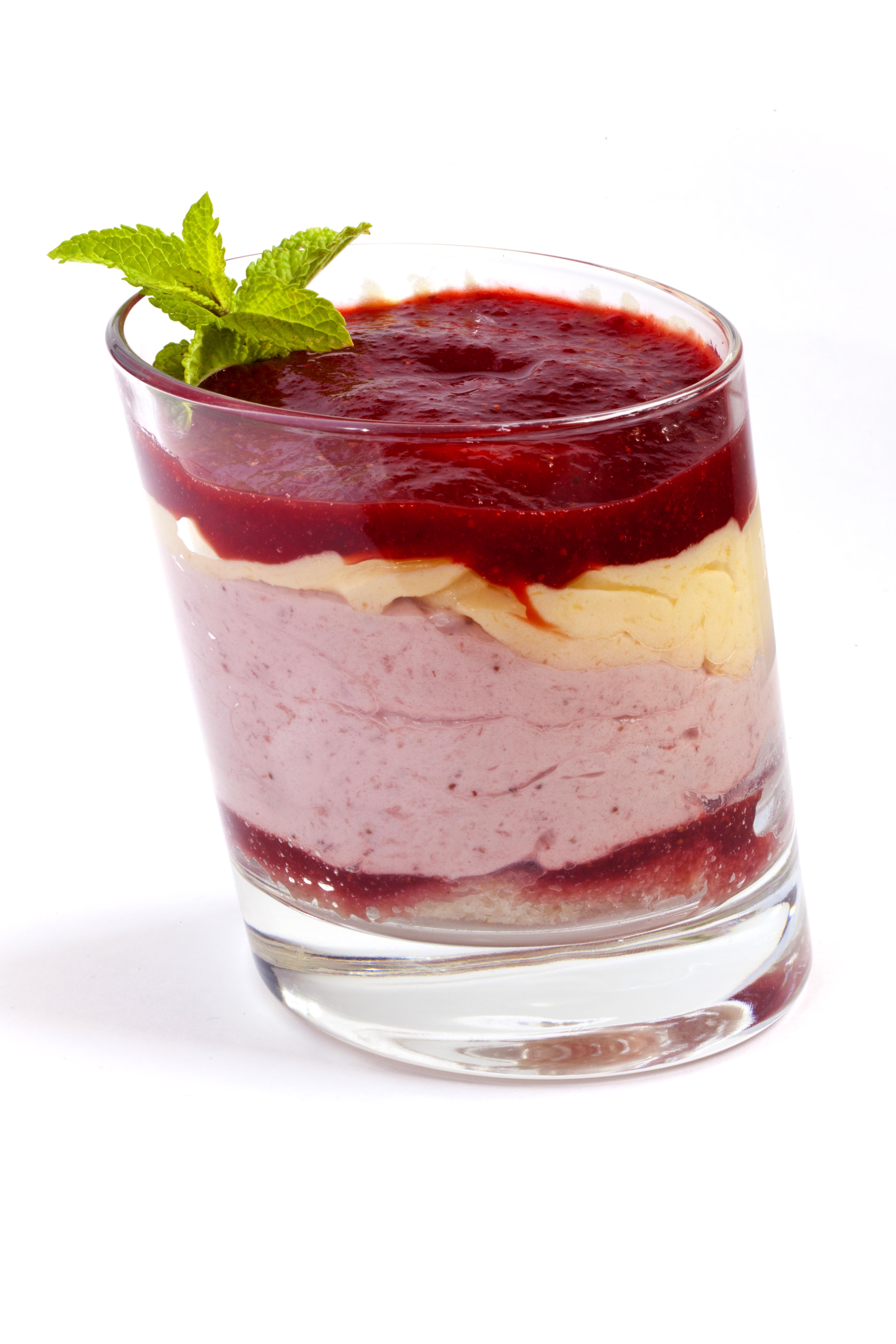 Abocau una capa de mousse de maduixes dins cada tassó. Damunt, una de mousse de mango. Repartiu la meitat de la preparació de maduixes que havíeu reservat per sobre i decorau els tassonets amb unes fulles d’herba sana just en el moment de servir la mousse.