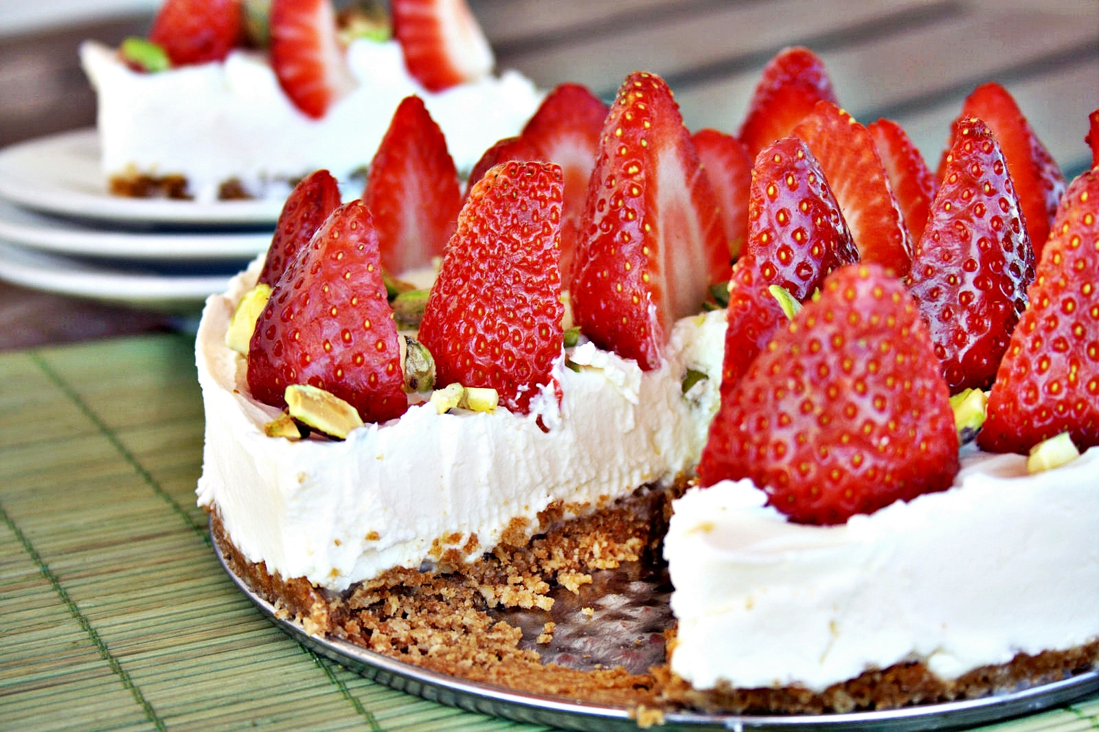 Quan hagi reposat, desemmotllem amb molt de compte i hi col·loquem per sobre les maduixes tallades per la meitat i els festucs en bocins.