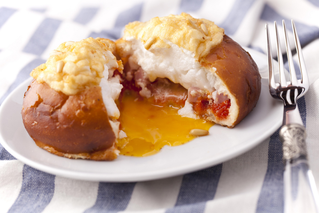 Escapçau les magranetes i buidau-les, però amb compte que no es foradin. Ha de quedar una capa de pasta de devers un dit per tot. Posau dins cada panet (fons i voreres) quatre cullerades o cinc de llet de manera que quedi humit per dins. Ara abocau dues o tres cullerades de salsa de tomàtiga al fons de cada panet. Damunt, uns quants daus de cuixot i damunt, un vermell d’ou. Reservau els blancs dins un bol.